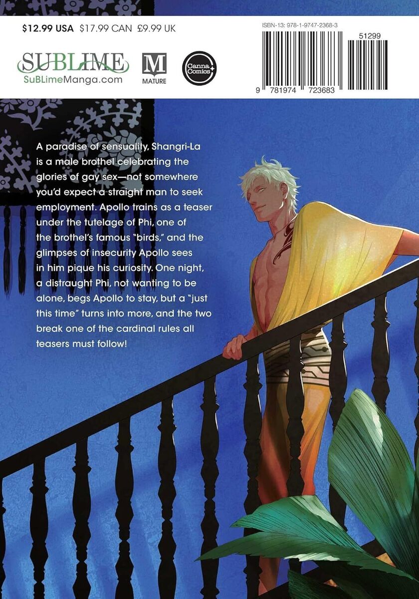 A paradise of sensuality, Shangri-La is a male brothel celebrating the glories of gay sex—not somewhere you’d expect a straight man to seek employment. Apollo trains as a teaser under the tutelage of Phi, one of the brothel’s famous "birds," and the glimpses of insecurity Apollo sees in him pique his curiosity. One night, a distraught Phi, not wanting to be alone, begs Apollo to stay, but a "just this time" turns into more, and the two break one of the cardinal rules all teasers must follow!